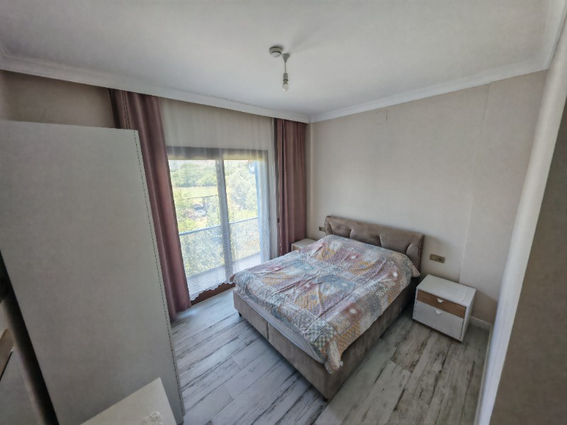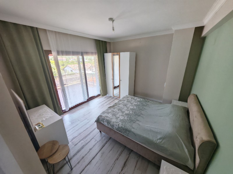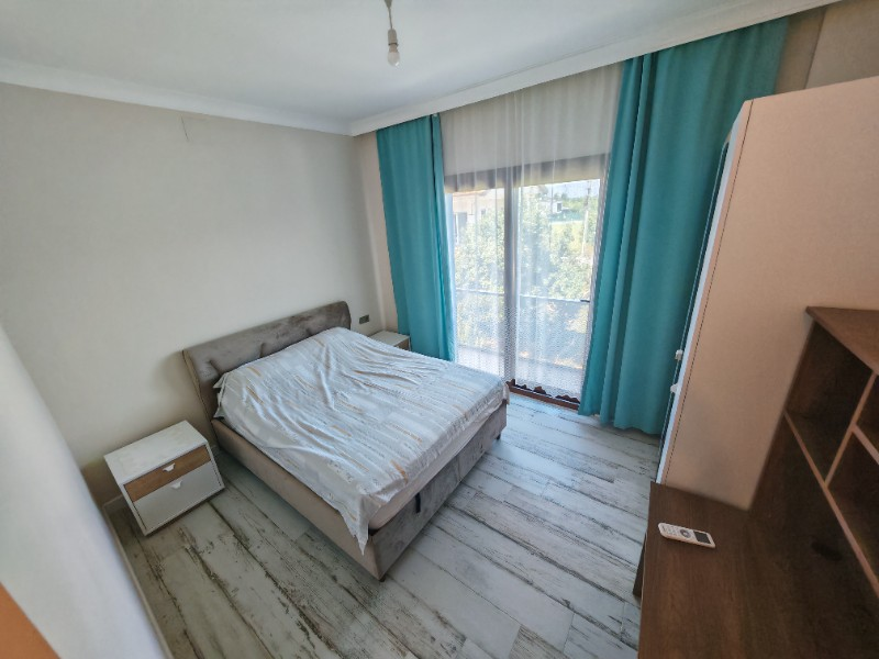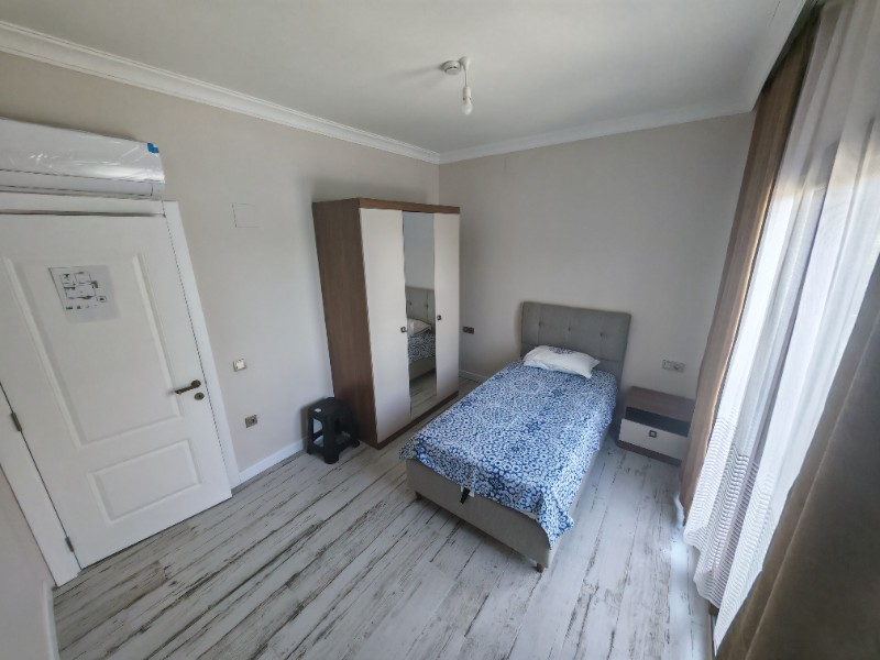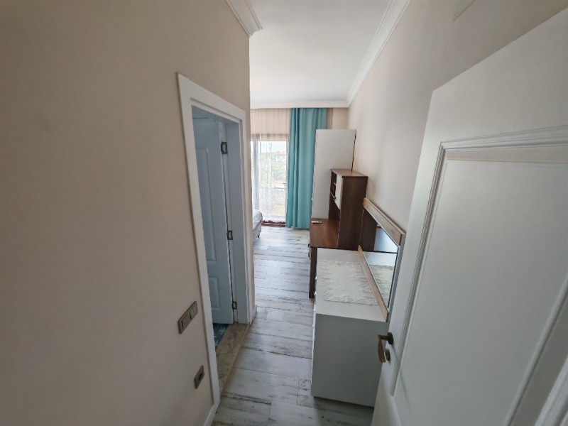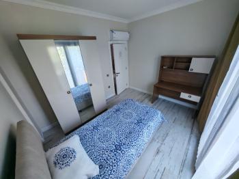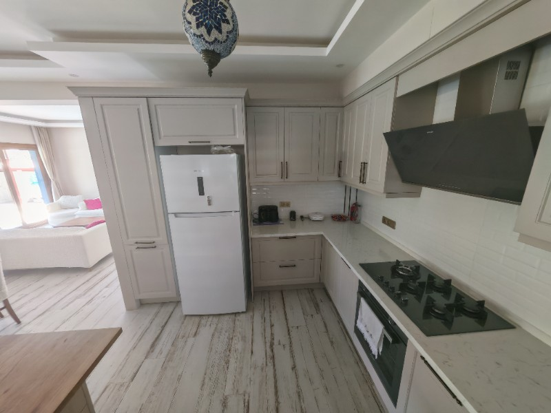 Giriş Kat: 45 m² ferah, şömineli ve klimalı salon, tam donanımlı mutfak, 2 adet çalışma masalı yatak odası ve genel banyo.