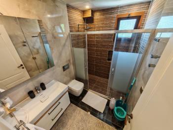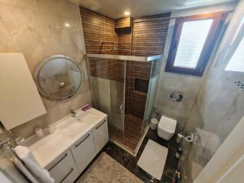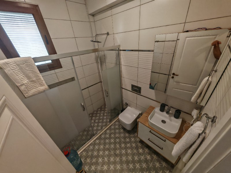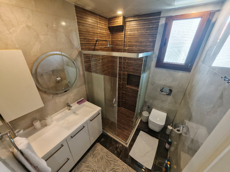 Üst Kat: Her biri kendine ait banyosu olan (Ebeveyn Banyolu) ve klimalı 3 adet geniş yatak odası ve balkonlar. Ana yatak odası 32 m² olup harika bir doğa manzarasına sahiptir.